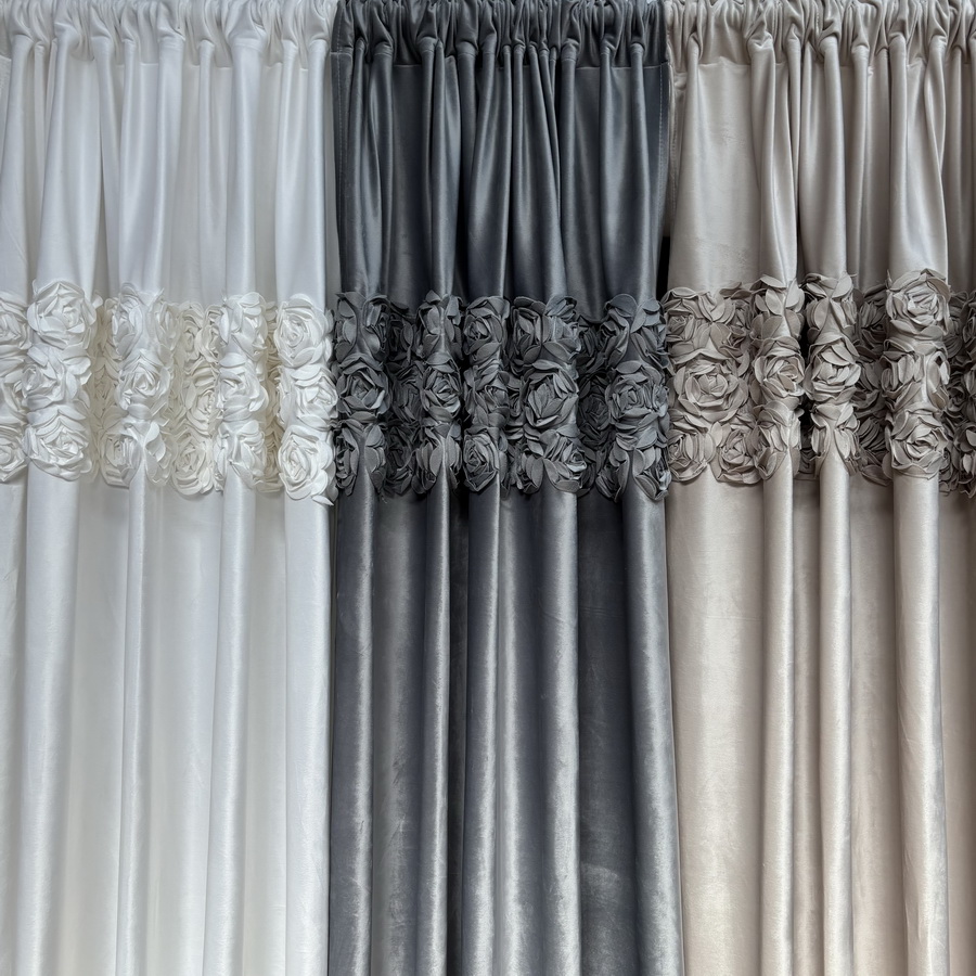 Zasłona welwetowa Szara na taśmie z pasem róż 140x270 cm AR19