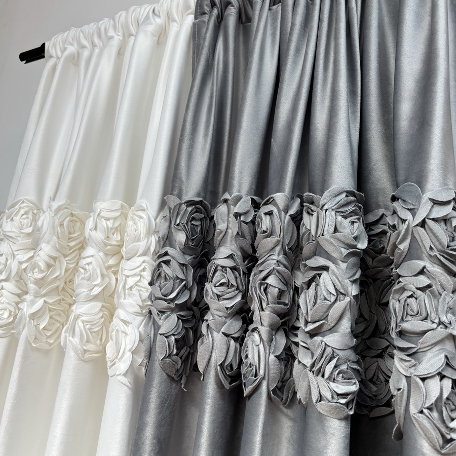 z wysokogatunkowej tkaniny welwetowej, wykończona u góry dekoracyjnym wzorem pasowym, to elegancka dekoracja okna, która łączy w sobie styl i funkcjonalność. Jej wyjątkowość podkreśla naszyty, pasowy wzór z kwiatów róż, który dodaje romantycznego i eleganckiego charakteru. Zasłona zachwyca aksamitnym dotykiem i głębokim, nasyconym kolorem, dodając wnętrzu przytulności i szlachetnego wyglądu.