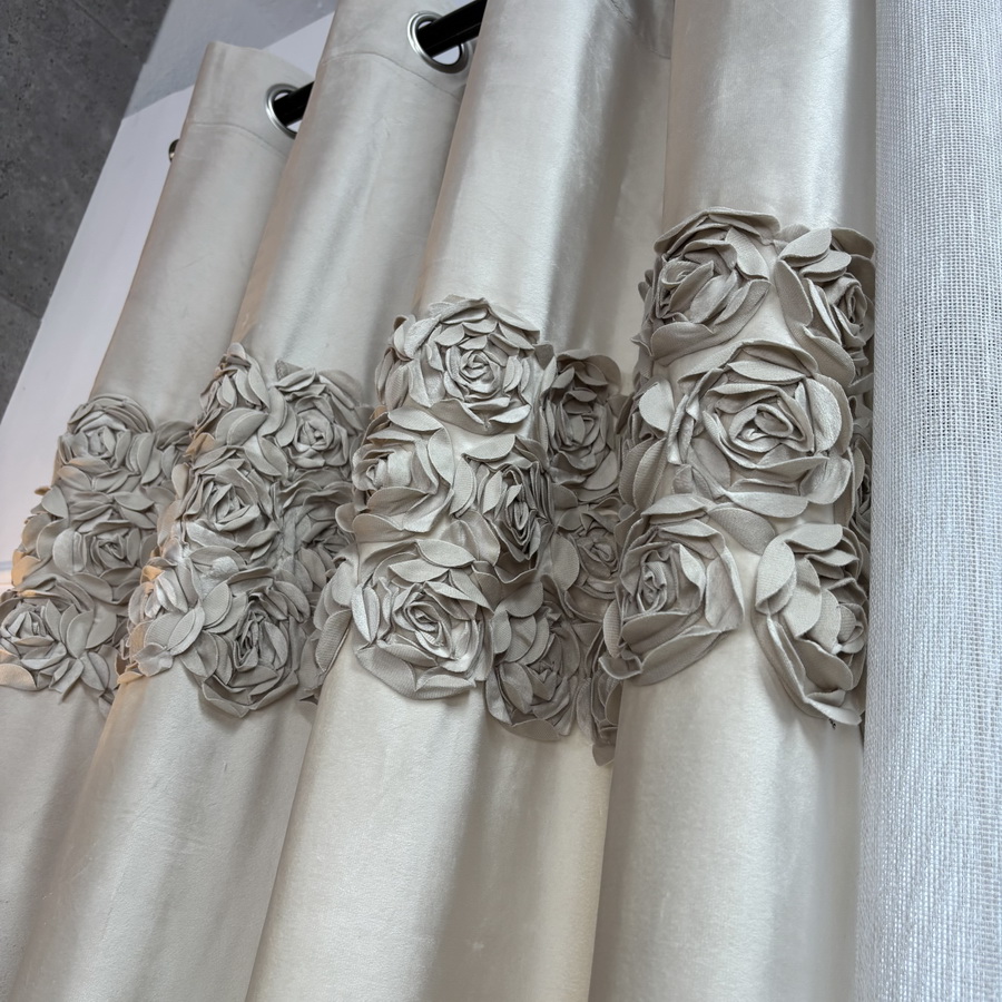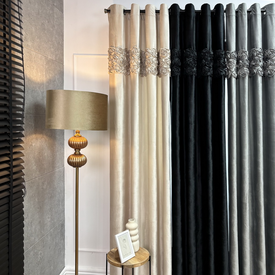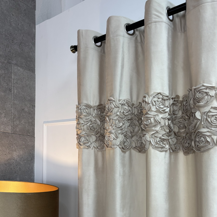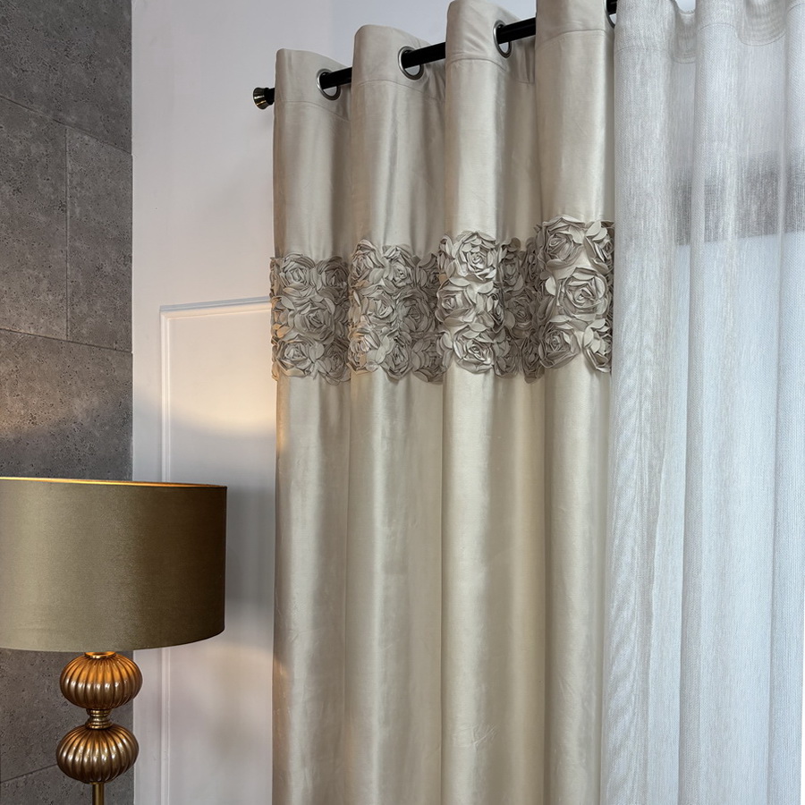 Zasłona welwetowa beżowa na przelotkach z pasem róż 140x250 cm AR19
