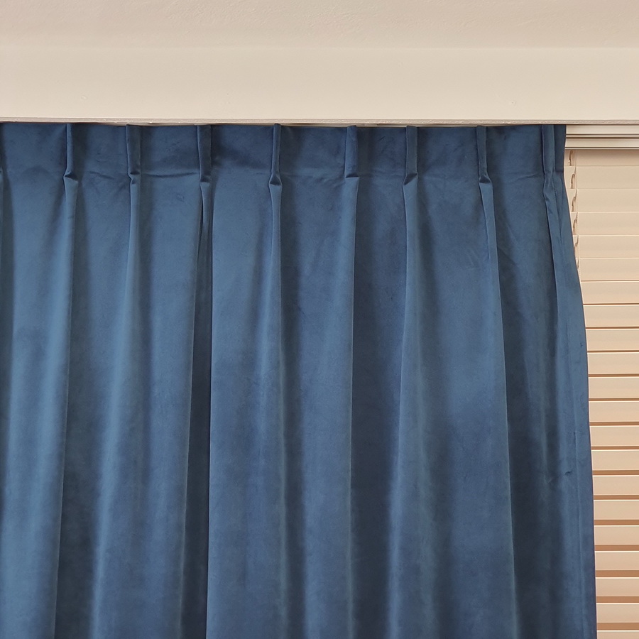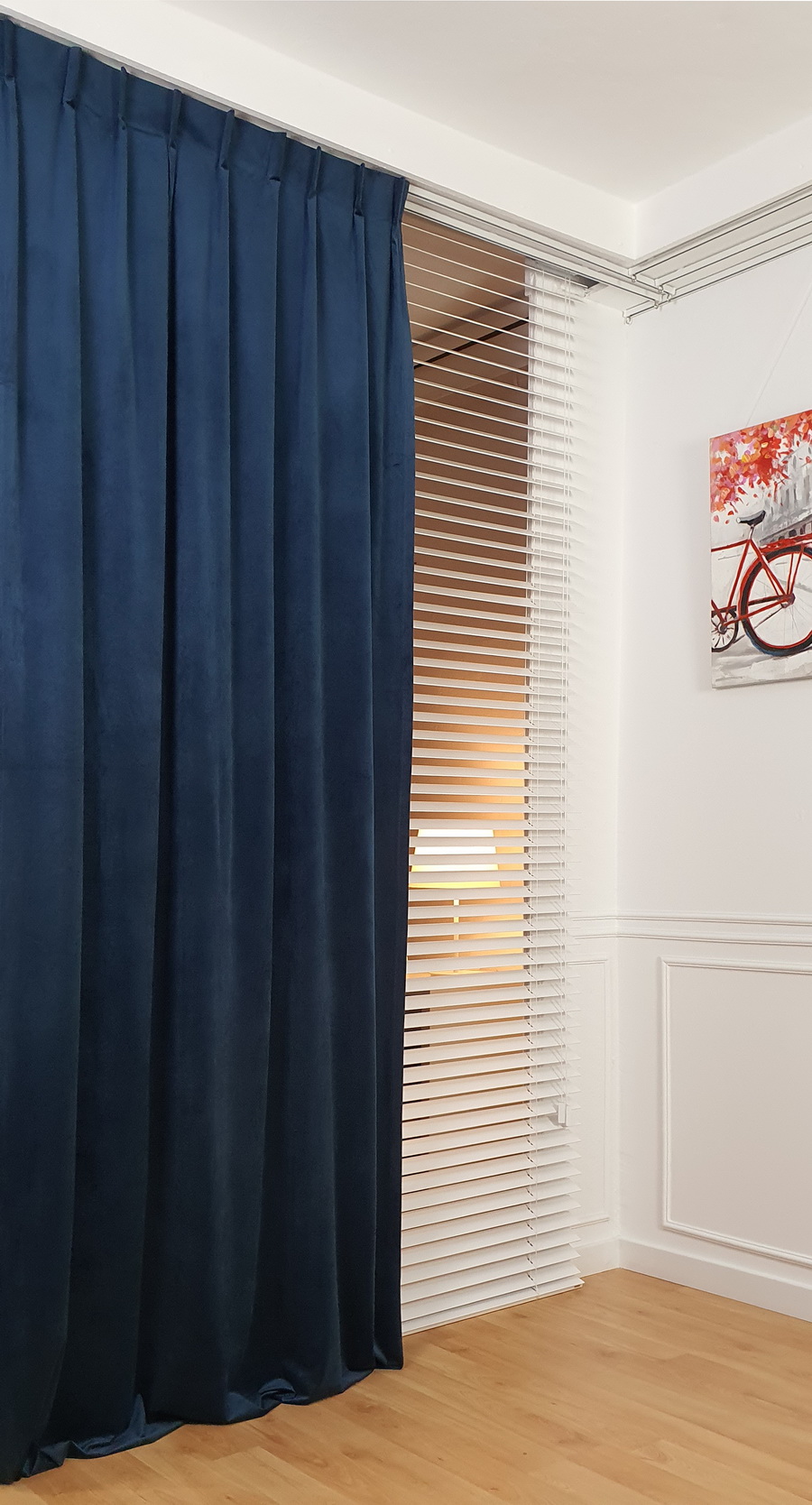 Zasłona na zamówienie w kolorze ciemnoniebieskim z tkaniny zaciemniającej 60%.