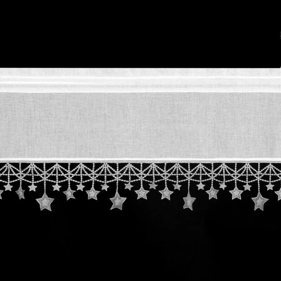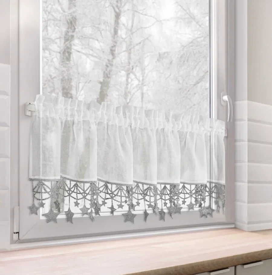 Ta stylowa zazdrostka to delikatna i subtelna dekoracja okna, idealna zwłaszcza na okres świąteczny lub dla nadania wnętrzu zimowego, nastrojowego charakteru. Wykonana z lekkiej, półtransparentnej etaminy, pięknie rozprasza światło, wpuszczając je do wnętrza, ale jednocześnie zapewniając dyskrecję. Jej największą ozdobą jest dół wykończony aplikacją luźno zwisających srebrnych gwiazdek, dodających uroku, lekkości i świątecznego blasku.