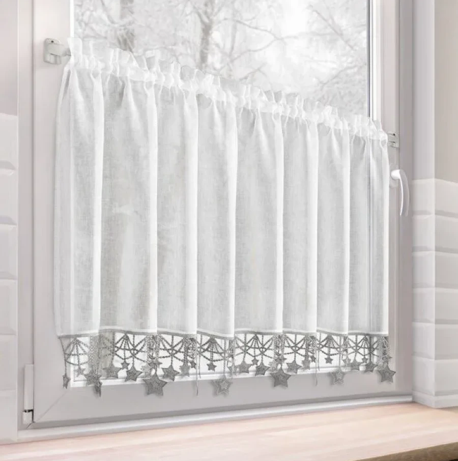 Ta stylowa zazdrostka to delikatna i subtelna dekoracja okna, idealna zwłaszcza na okres świąteczny lub dla nadania wnętrzu zimowego, nastrojowego charakteru. Wykonana z lekkiej, półtransparentnej etaminy, pięknie rozprasza światło, wpuszczając je do wnętrza, ale jednocześnie zapewniając dyskrecję. Jej największą ozdobą jest dół wykończony aplikacją luźno zwisających srebrnych gwiazdek, dodających uroku, lekkości i świątecznego blasku.