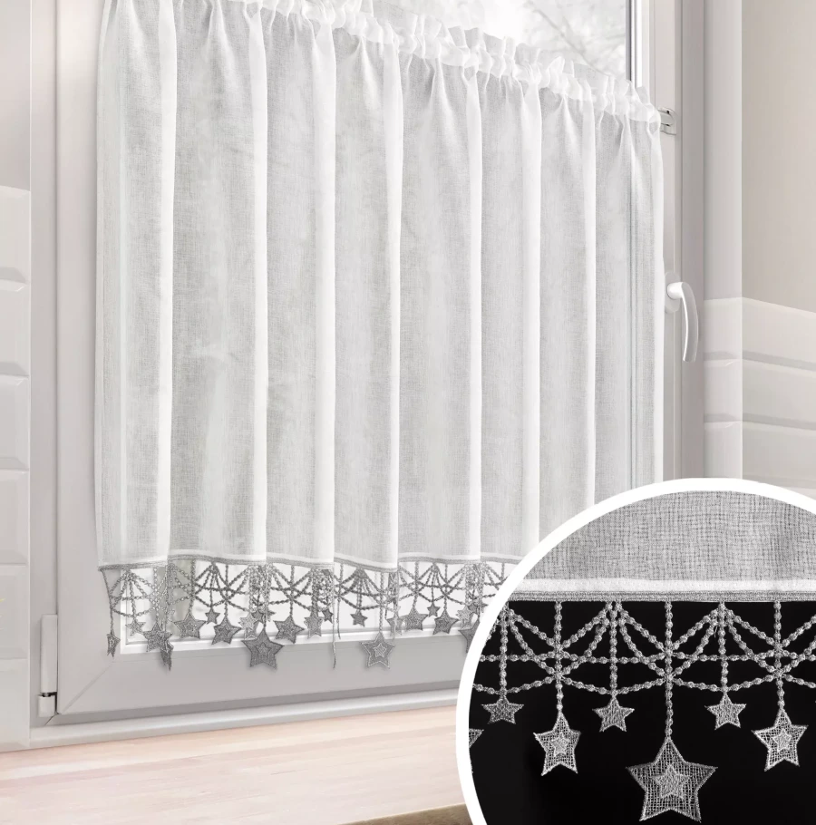Ta stylowa zazdrostka to delikatna i subtelna dekoracja okna, idealna zwłaszcza na okres świąteczny lub dla nadania wnętrzu zimowego, nastrojowego charakteru. Wykonana z lekkiej, półtransparentnej etaminy, pięknie rozprasza światło, wpuszczając je do wnętrza, ale jednocześnie zapewniając dyskrecję. Jej największą ozdobą jest dół wykończony aplikacją luźno zwisających srebrnych gwiazdek, dodających uroku, lekkości i świątecznego blasku.